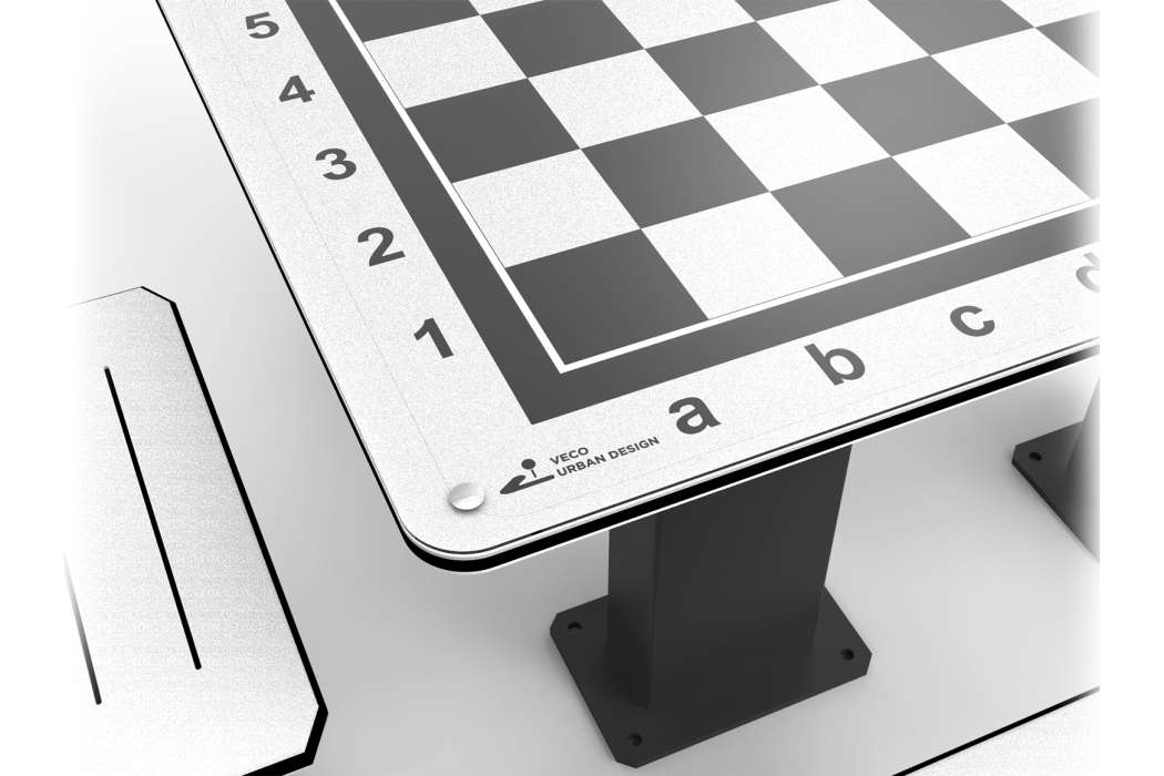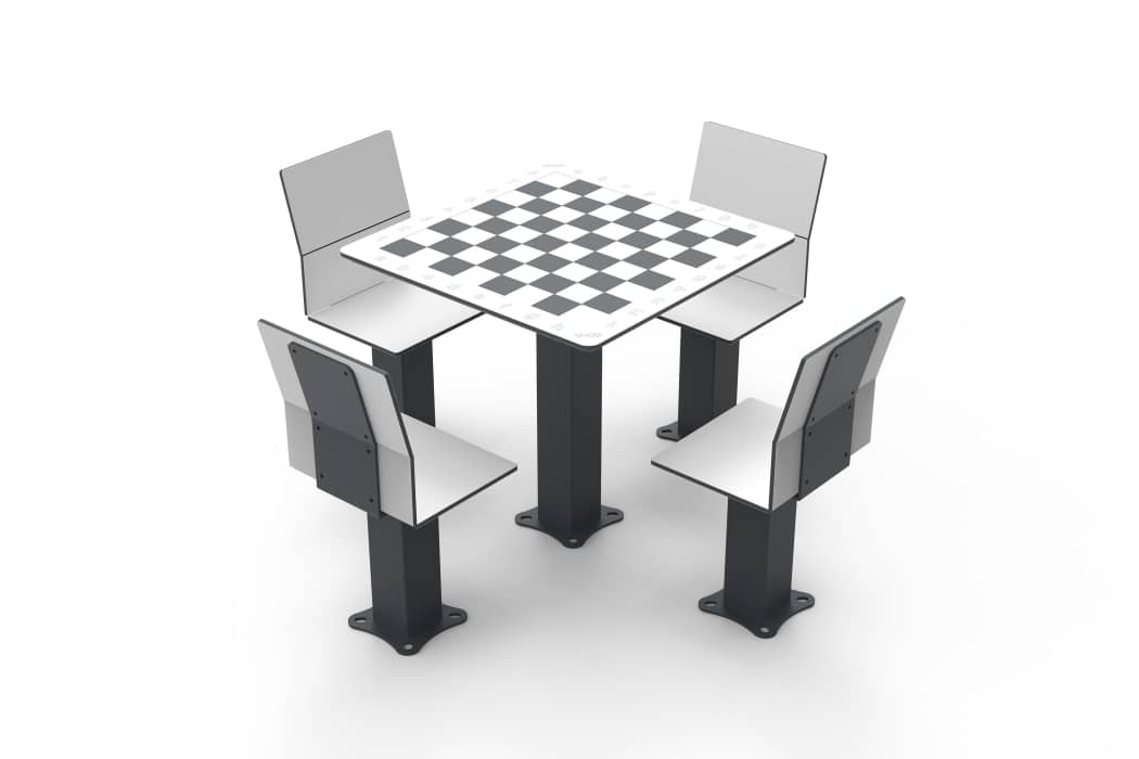 Outdoor chess table with integrated benches, built from powder-coated metal and HPL. Durable, weather-resistant, and ideal for schoolyards or parks. Fixes via metallic anchors.