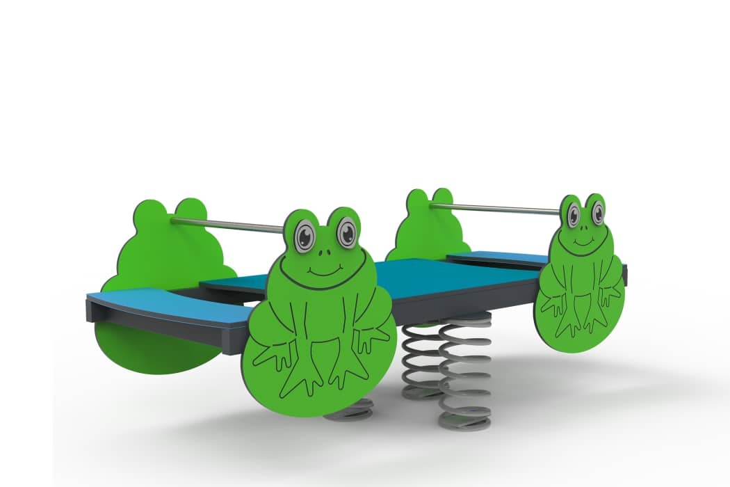 Playful frog-themed spring rocker for young children. Supports 6 users aged 3–12. Constructed from lacquered aluminium, polyethylene, and injected plastic components.