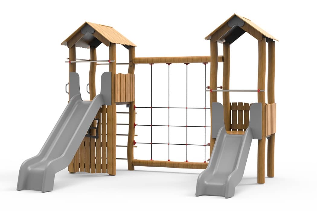 Twin timber towers with slides and climbing elements for ages 3–12. Made from Robinia wood and built for 9 users, this EN 1176-compliant structure blends nature with adventure play.